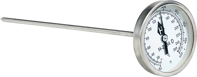 Direct-reading, all-metal dial thermometers for general use include °F and °C scales. Units have bi-metal element that actuates pointer over graduated dial. Stainless steel stem is 8″ long x 0.15″ (203 x 4mm). Dial face is 1-3/4″ (45mm) dia. External adjustment allows recalibration.