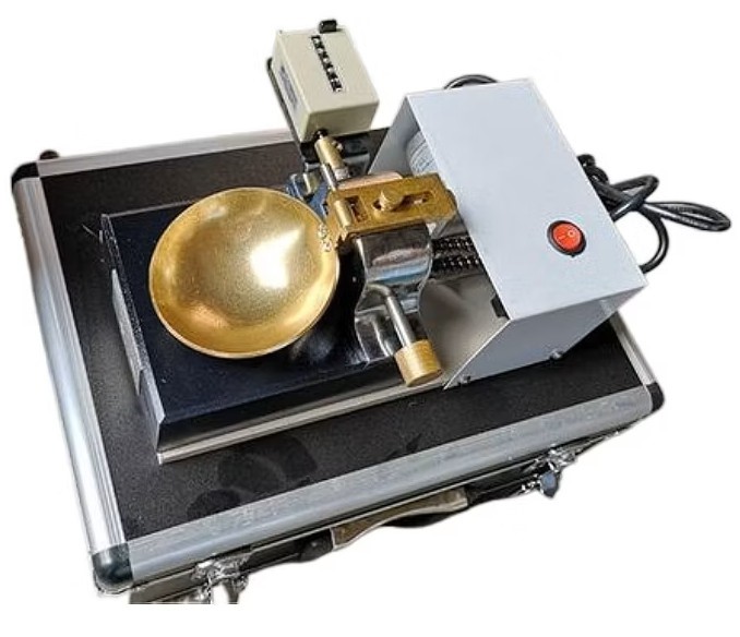 The Liquid Limit Device features a hard rubber base supporting a sliding carriage with a hinged brass cup. The cup is lifted and dropped from a height of 1 cm onto the rubber base using a lead screw located at the back of the carriage. The device comes complete with a Casagrande grooving tool and a gauge block (Type A, as per IS: 9259).