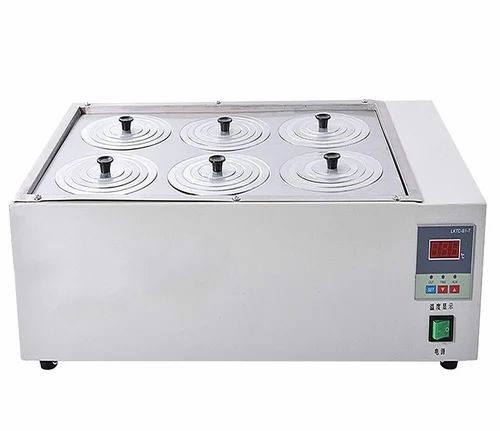 This appears to be a standard laboratory-grade rectangular water bath designed for precise temperature control in experiments involving incubation, heating, or evaporation of samples. It’s commonly used in chemistry, biology, and material testing labs for maintaining stable water temperatures around beakers or flasks placed in the holes on the lid. The design emphasizes durability, insulation for energy efficiency, and ease of use with concentric rings to accommodate various vessel sizes.